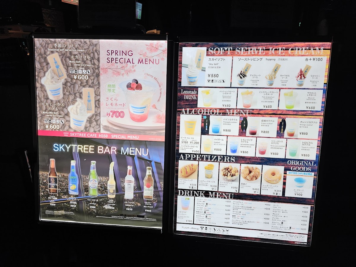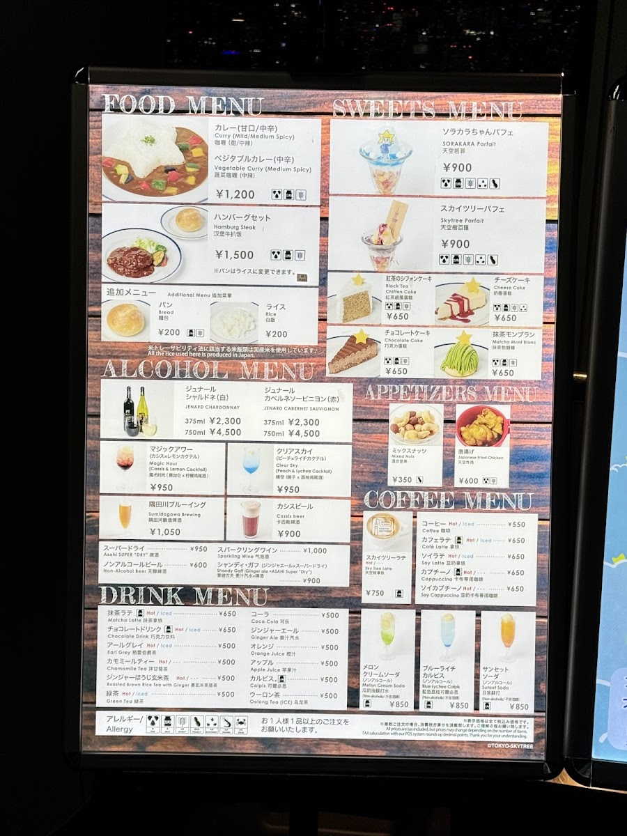 The menu features a variety of offerings that cater to diverse tastes. Start off with the Magic Hour, a refreshing drink priced at JP¥850, or indulge in their Skytree Latte (Hot) for JP¥750. For those craving something savory, try the Curry, available in either mild or medium spiciness for JP¥1,200.